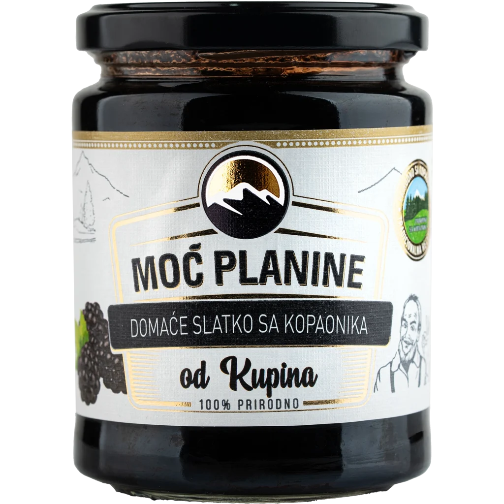 The forest queen or wild blackberries are one of the most aromatic delicacies from our cuisine. Homemade blackberry jam made of wild blackberries picked up in the forests of Kopaonik. It is prepared in the traditional way according to the recipe of our ancestors. The ripest juicy blackberries are cooked in sugar syrup until we obtain the ideal consistency, smell and taste for which this preserve is specific. No added preservatives, artificial colours or flavours.