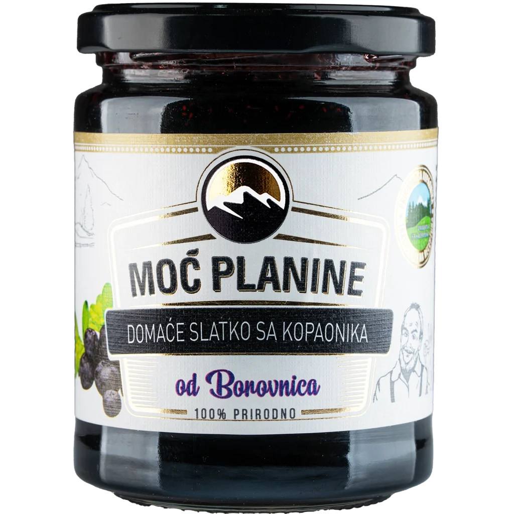 Homemade thin fruit preserve from wild blueberries (bilberries) made of the juiciest and largest fruits of blueberries from the slopes of Kopaonik, hand-picked by the local population. It is prepared according to a traditional recipe where we choose the ripest blueberry fruits and then cook them in sugar syrup in large pots until the desired consistency and quality is obtained. This thin fruit preserve has a very specific, pleasant taste and smell, is recommended for both young and old as an ideal delicacy for every day. No added preservatives, artificial colours or flavours.