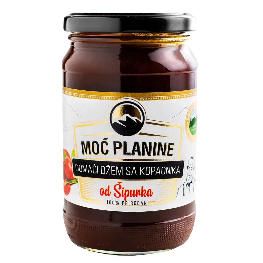 Domaći džem napravljen od divljih šipka koje mještani ručno beru na obroncima Kopaonika. Šipak je poznat i kao kralj biljaka, jer je nevjerovatno koristan za zdravlje, vitalnost i ishranu. Džem od šipka sadrži bogatstvo vitamina C, minerala i korisnih kiselina. Priprema se po tradicionalnom receptu koji su naši preci prenosili i pažljivo čuvali vekovima. Ne dodaju se konzervansi, veštačke boje ili arome.